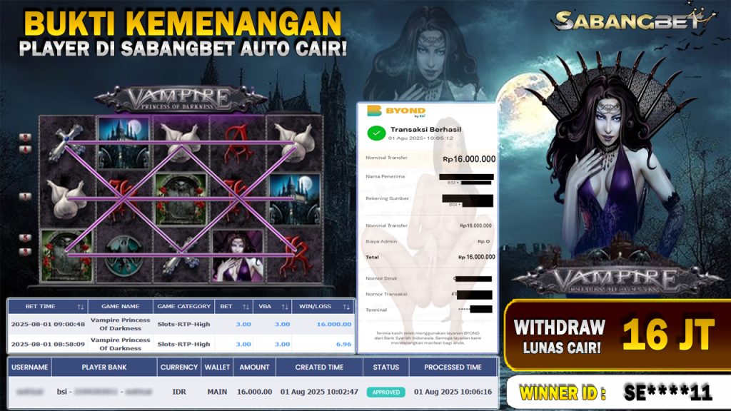 BUKTI KEMENANGAN 01 AGUSTUS 2025 DI GAME Vampire Princess Of Darkness WD 16 JUTA