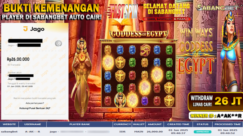 BUKTI KEMENANGAN 01 JANUARI 2026 DI GAME GODDESS OF EGYPT WD 26 JUTA