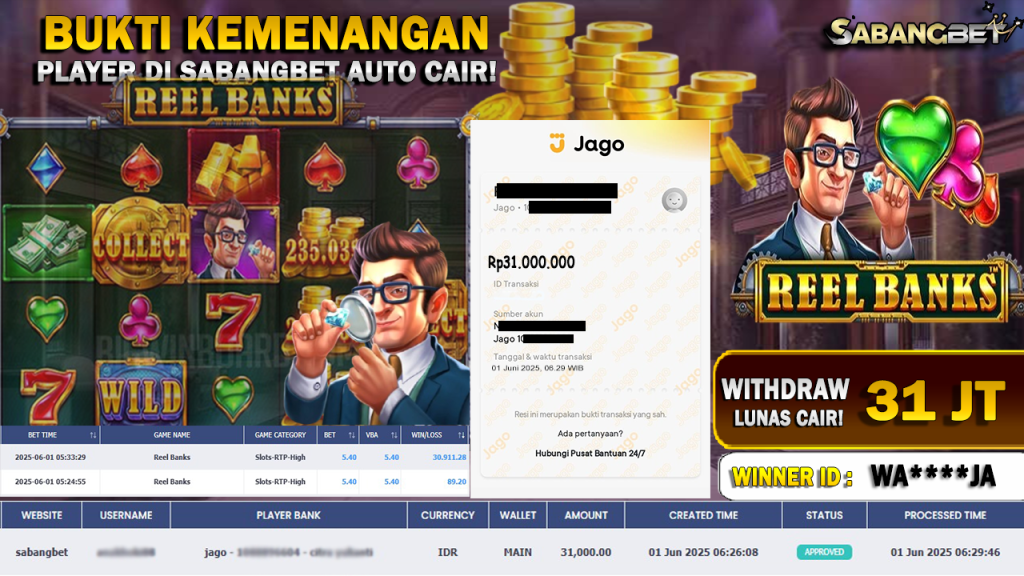 BUKTI KEMENANGAN 01 JUNI 2025 DI GAME REAL BANKS WD 31 JUTA