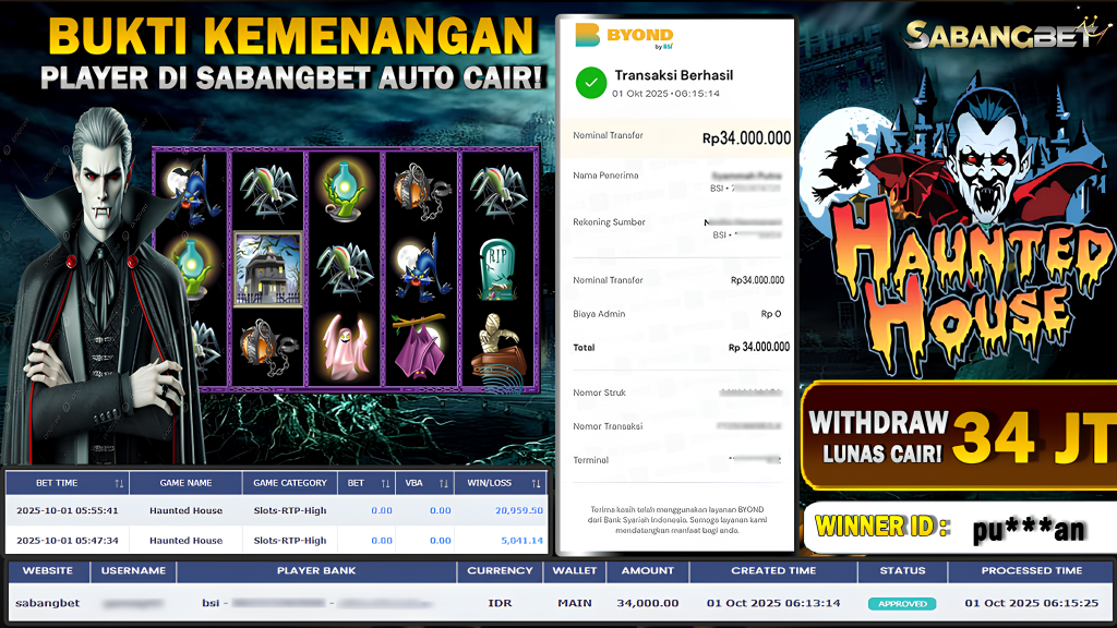 BUKTI KEMENANGAN 01 OKTOBER 2025 DI GAME HAUNTED HOUSE WD 34 JUTA