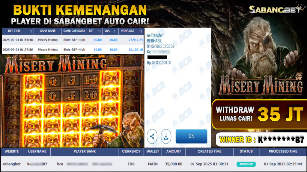 BUKTI KEMENANGAN 01 SEPTEMBER 2025 DI GAME MISERY MINING WD 35 JUTA