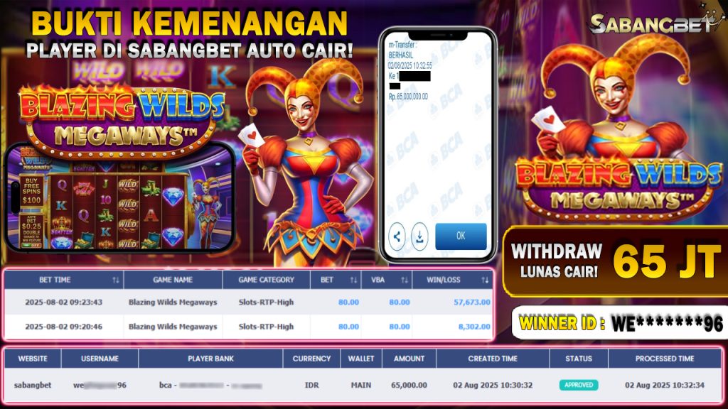 BUKTI KEMENANGAN 02 AGUSTUS 2025 DI GAME BLAZING WILDS MEGAWAYS WD 65 JUTA