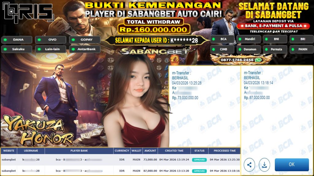 BUKTI KEMENANGAN 02 MARET 2026 DI GAME YAKUZA HONOR WD 160 JUTA