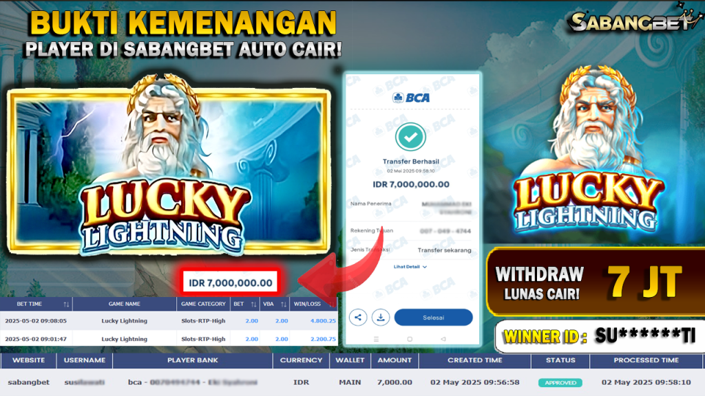 BUKTI KEMENANGAN 02 MEI 2025 DI GAME LUCKY LIGHTNING WD 7 JUTA
