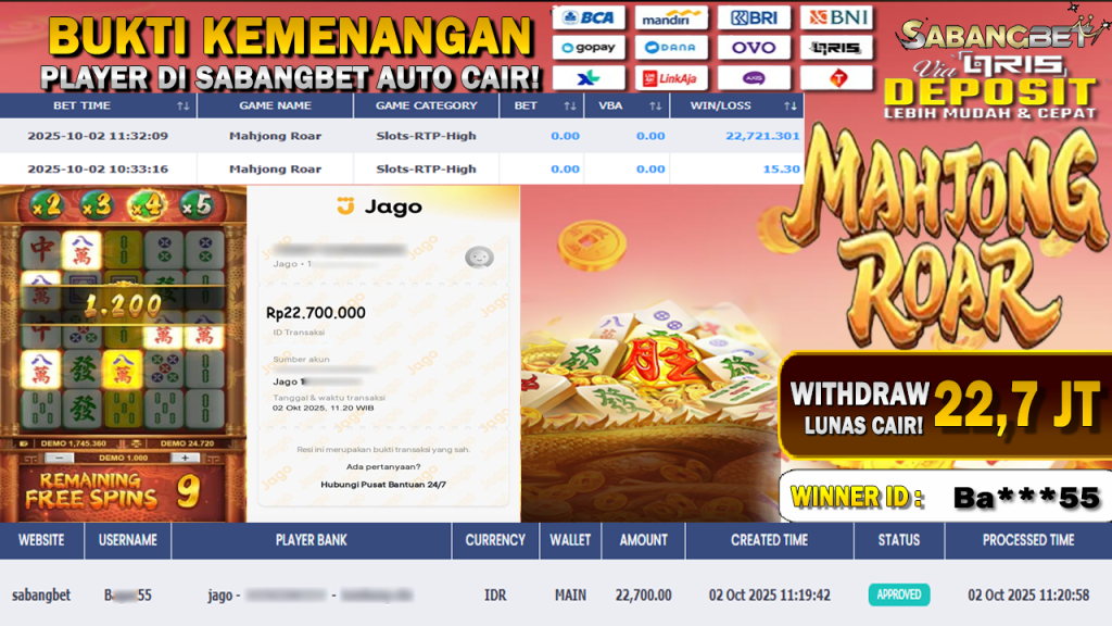 BUKTI KEMENANGAN 02 OKTOBER 2025 DI GAME MAHJONG ROAR WD 22,7 JUTA
