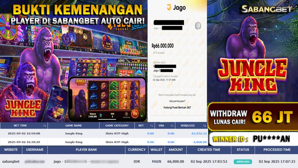 BUKTI KEMENANGAN 02 SEPTEMBER 2025 DI GAME JUNGLE KING WD 66 JUTA