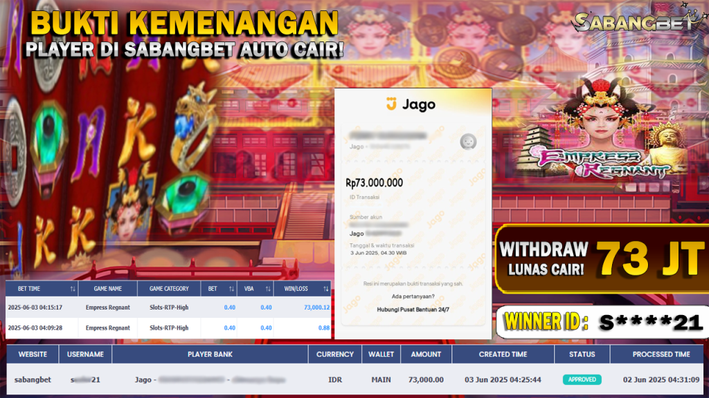 BUKTI KEMENANGAN 03 JUNI 2025 DI EMPRESS REGNANT GAME WD 73 JUTA