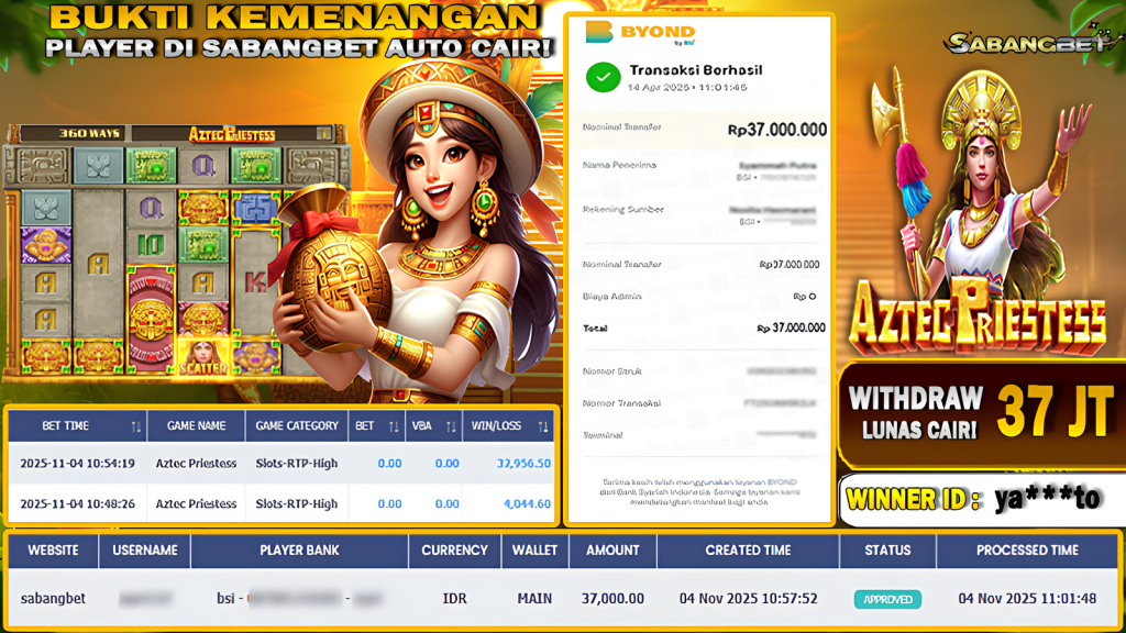 BUKTI KEMENANGAN 04 NOVEMBER 2025 DI GAME AZTEC PRIESTESS WD 37 JUTA