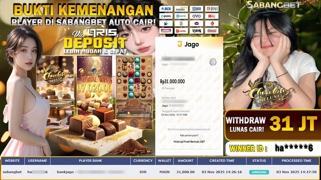 BUKTI KEMENANGAN 03 NOVEMBER 2025 DI GAME CHOCOLATE DELUXE WD 31 JUTA