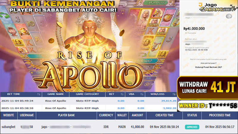 BUKTI KEMENANGAN 04 NOVEMBER 2025 DI GAME RISE OF APOLLO WD 41 JUTA