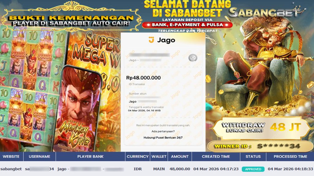 BUKTI KEMENANGAN 04 MARET 2026 DI GAME LEGENDARY MONKEY KING WD 48 JUTA