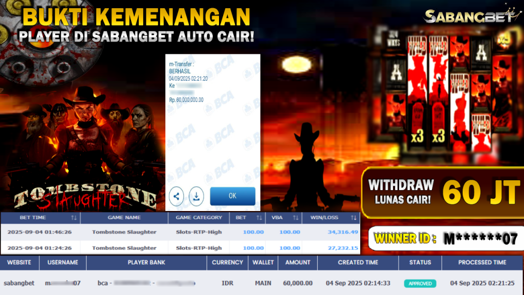 BUKTI KEMENANGAN 04 SEPTEMBER 2025 DI GAME TOMBSTONE SLAUGHTER 60 JUTA