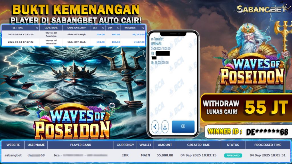 BUKTI KEMENANGAN 04 SEPTEMBER 2025 DI GAME WAVES OF POSEIDON WD 55 JUTA