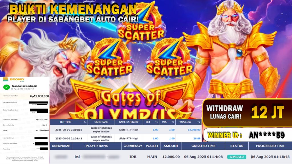 BUKTI KEMENANGAN 06 AGUSTUS 2025 DI gates of olympus super scatter WD 12 JUTA