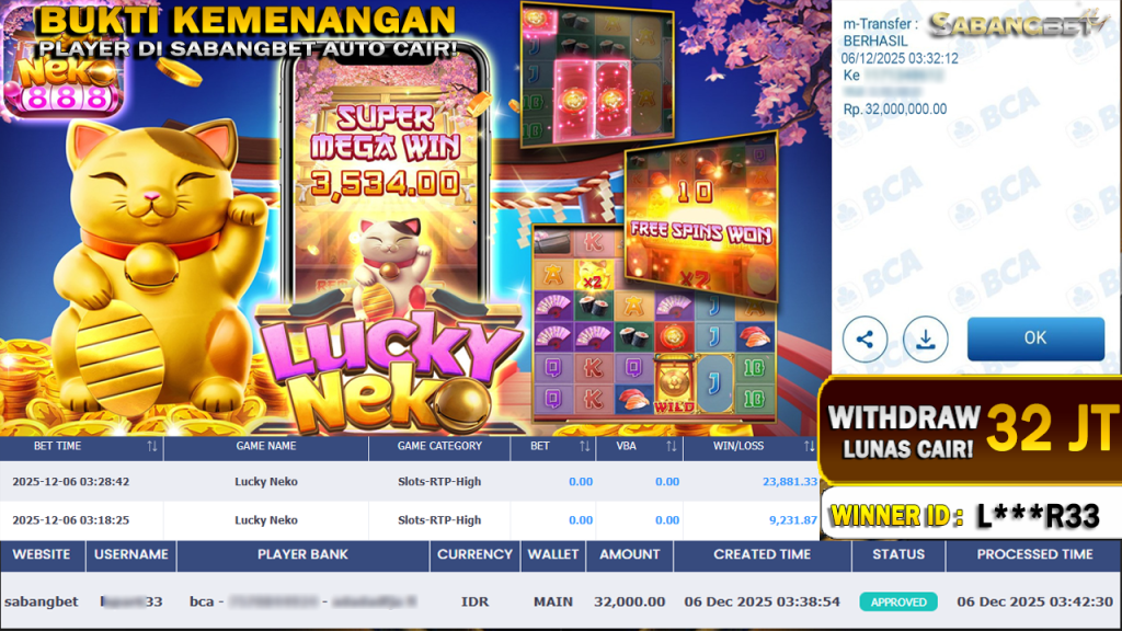 BUKTI KEMENANGAN 06 DESEMBER 2025 DI GAME LUCKY NEKO WD 32 JUTA