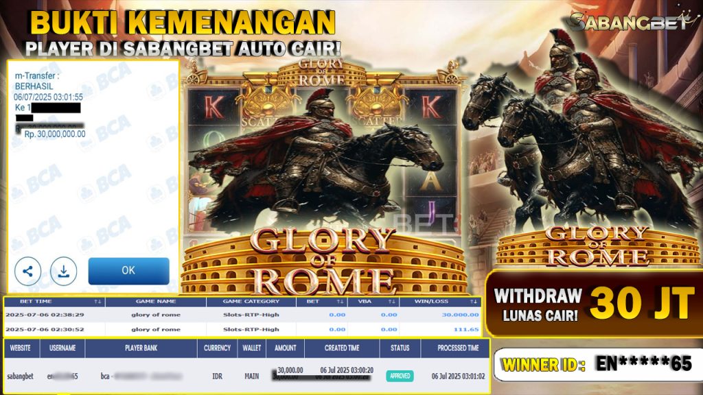 BUKTI KEMENANGAN 06 JULY 2025 DI GAME GLORY OF ROME WD 30 JUTA