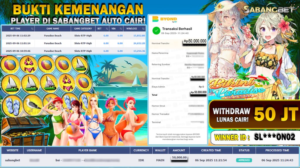 BUKTI KEMENANGAN 06 SEPTEMBER 2025 DI GAME BIKINI PARADISE WITHDRAW 50 JUTA