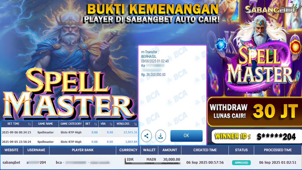 BUKTI KEMENANGAN 06 SEPTEMBER 2025 DI GAME SPELL MASTER WD 30 JUTA