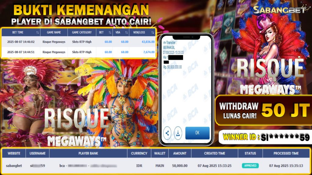 BUKTI KEMENANGAN 07 AGUSTUS 2025 DI GAME RISQUE MEGAWAYS WD 50 JUTA