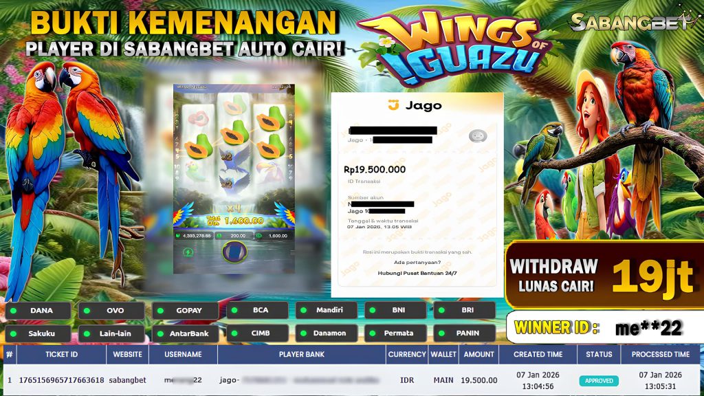 BUKTI KEMENANGAN 07 JANUARI 2026 DI GAME Wings Of Iguazu WD 19,5 JUTA