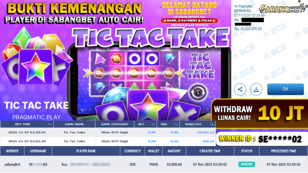 BUKTI KEMENANGAN 07 NOVEMBER 2025 DI GAME TIC TAC TAKE WD 10 JUTA