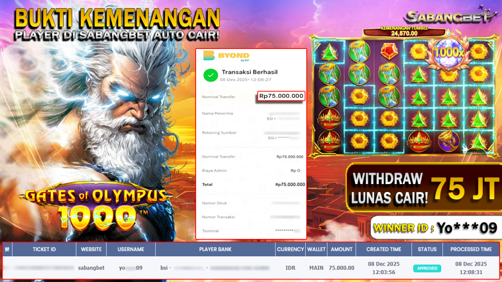BUKTI KEMENANGAN 08 DESEMBER 2025 DI GAME Gates Of Olympus 1000 WD 75 JUTA