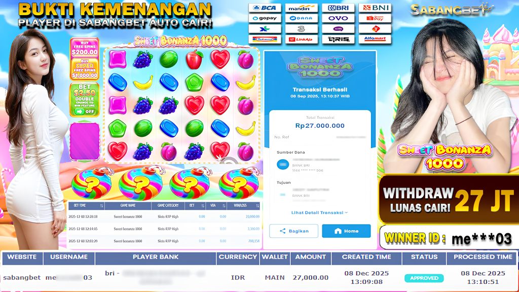 BUKTI KEMENANGAN 08 DESEMBER 2025 DI GAME SWEET BONANZA1000 WD 27 JUTA