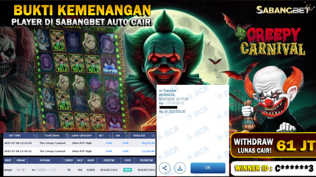 BUKTI KEMENANGAN 08 JULI 2025 DI GAME THE CREEPY CARNIVAL WD 61 JUTA