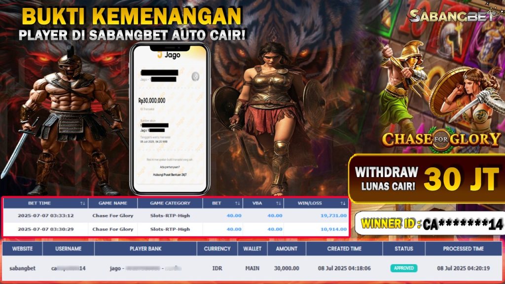 BUKTI KEMENANGAN 08 JULY 2025 DI GAME CHASE FOR GLORY WD 30 JUTA