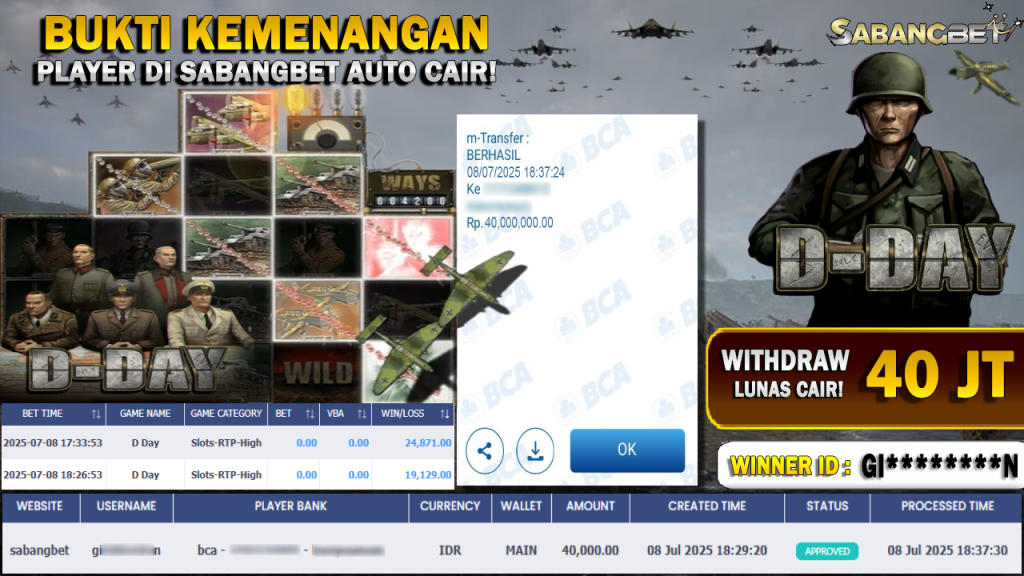BUKTI KEMENANGAN 08 JULY 2025 DI GAME D-DAY WD 40 JUTA