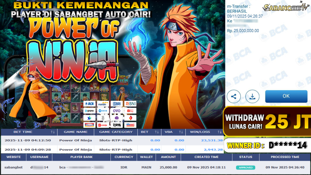 BUKTI KEMENANGAN 08 NOVEMBER 2025 DI GAME POWER OF NINJA 25 JUTA