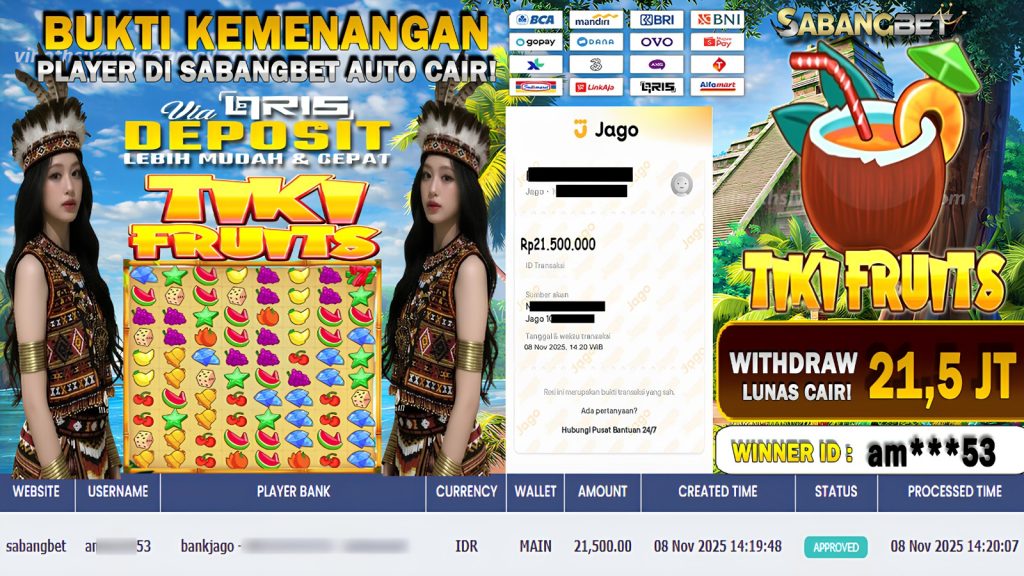 BUKTI KEMENANGAN 08 NOVEMBER 2025 DI GAME TIKI FRUITS WD 21,5 JUTA