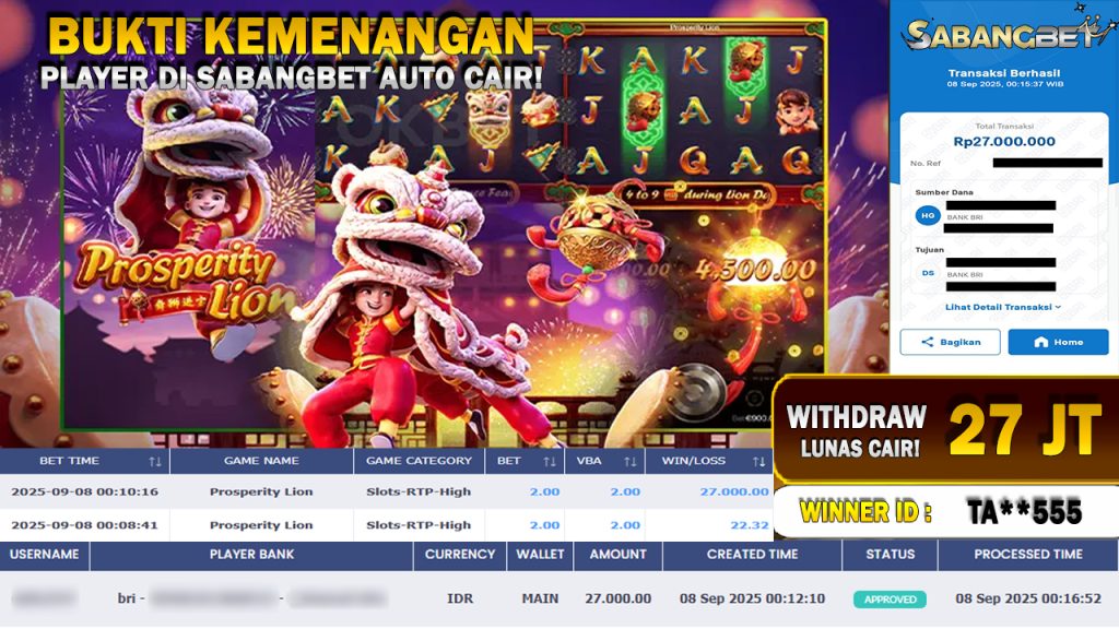 BUKTI KEMENANGAN 08 SEPTEMBER 2025 DI GAME Prosperity Lion WD 27 JUTA