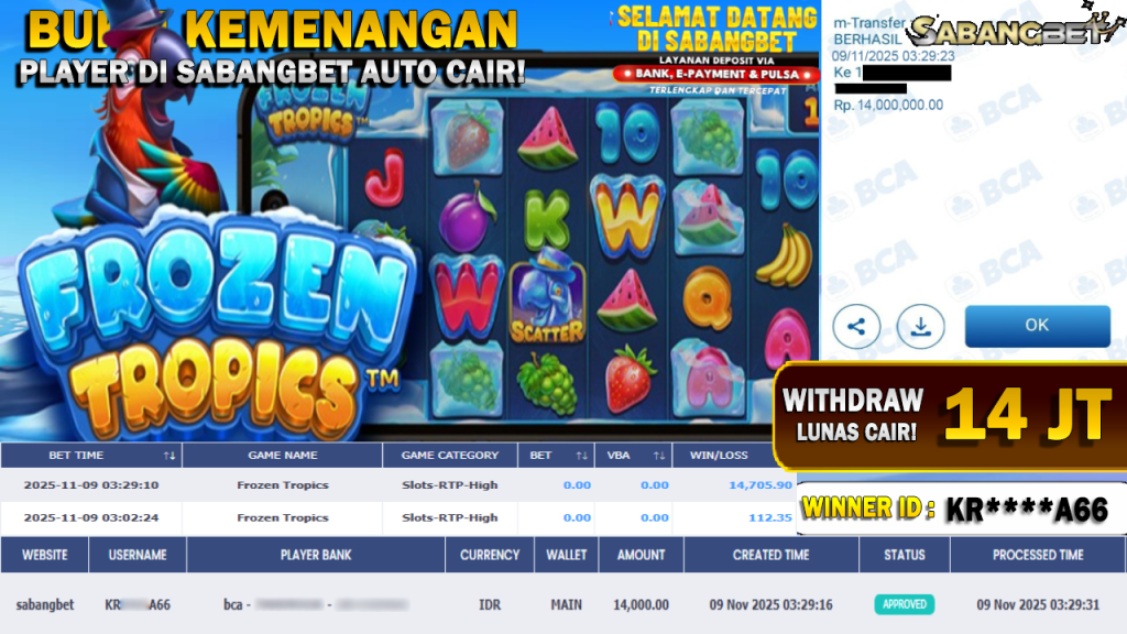 BUKTI KEMENANGAN 09 NOVEMBER 2025 DI GAME FROZEN TROPICS WD 14 JUTA