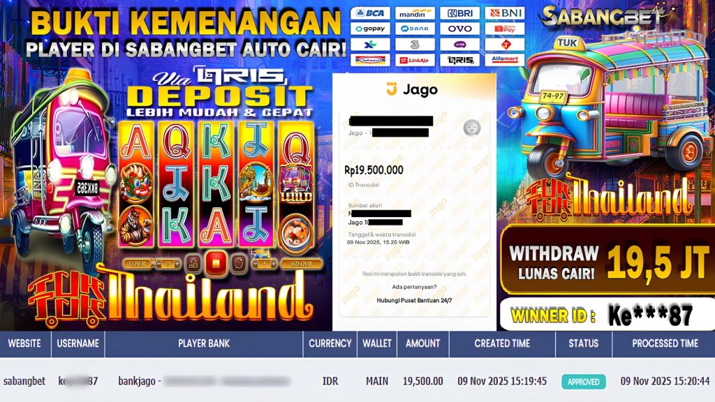 BUKTI KEMENANGAN 09 NOVEMBER 2025 DI GAME TUKTUK THAILAND WD 19,5 JUTA