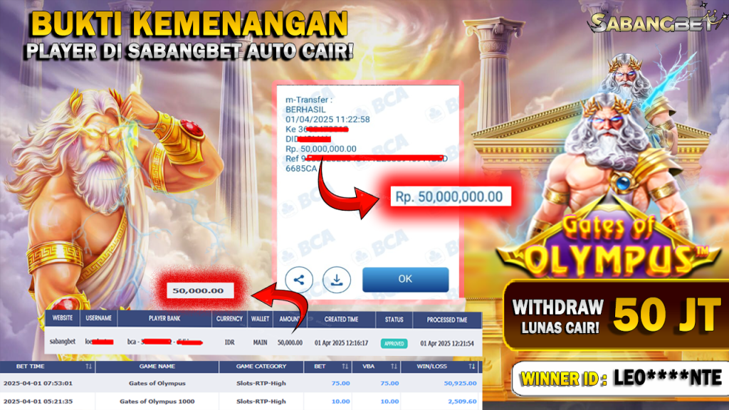 BUKTI KEMENANGAN 1 APRIL 2025 DI GAME GATES OF OLYMPUS WD 50 JUTA