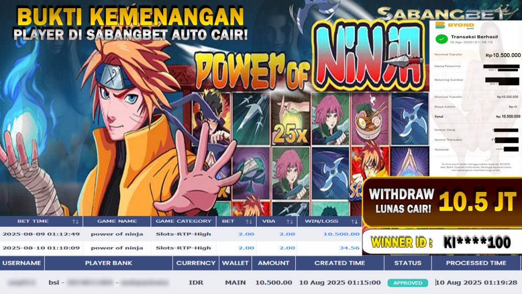 BUKTI KEMENANGAN 10 AGUSTUS 2025 DI GAME power of ninja WD 10.5 JUTA