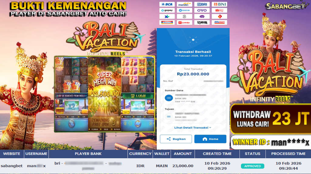 BUKTI KEMENANGAN 10 FEBRUARI 2026 DI GAME BALI VACATION WD 23 JUTA