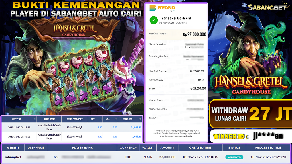 BUKTI KEMENANGAN 10 NOVEMBER 2025 DI GAME HANSEL & GRETEL CANDY HOUSE WD 27 JUTA