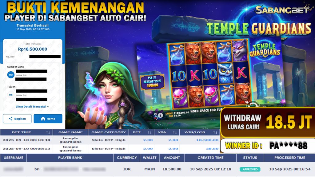 BUKTI KEMENANGAN 10 SEPTEMBER 2025 DI GAME temple guardians WD 18.5 JUTA