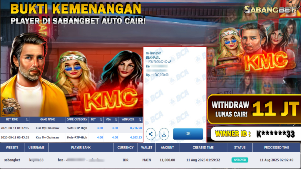 BUKTI KEMENANGAN 11 AGUSTUS 2025 DI GAME KISS MY CHAINSAW WD 11 JUTA