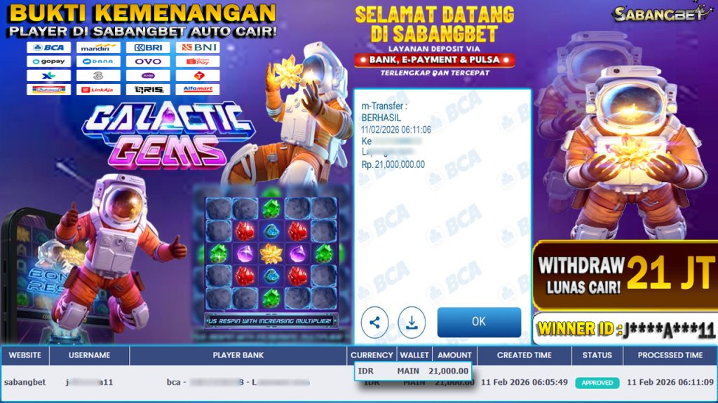 BUKTI KEMENANGAN 11 FEBRUARI 2026 DI GAME GALACTIC GEMS WD 21 JUTA