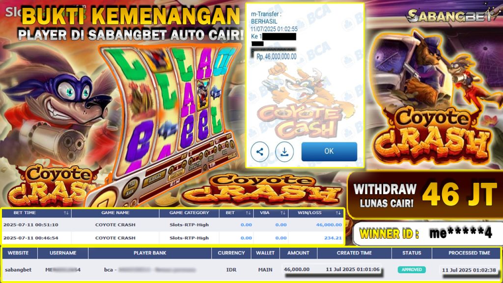 BUKTI KEMENANGAN 11 JULY 2025 DI GAME COYOTE CRASH WD 46 JUTA