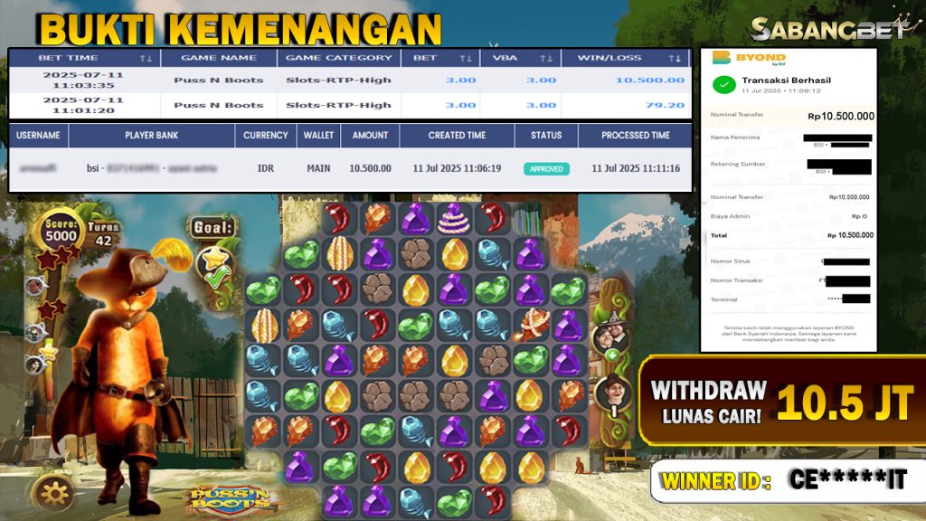 BUKTI KEMENANGAN 11 JULY 2025 DI puss n boots WD 10.5 JUTA