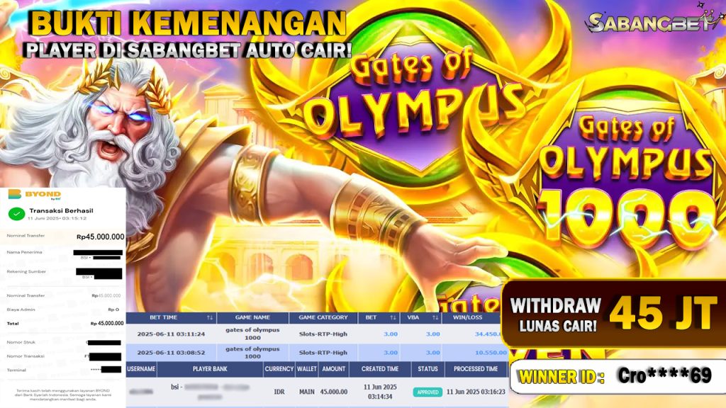 BUKTI KEMENANGAN 11 JUNI 2025 DI gates of olympus 1000 WD 45 JUTA