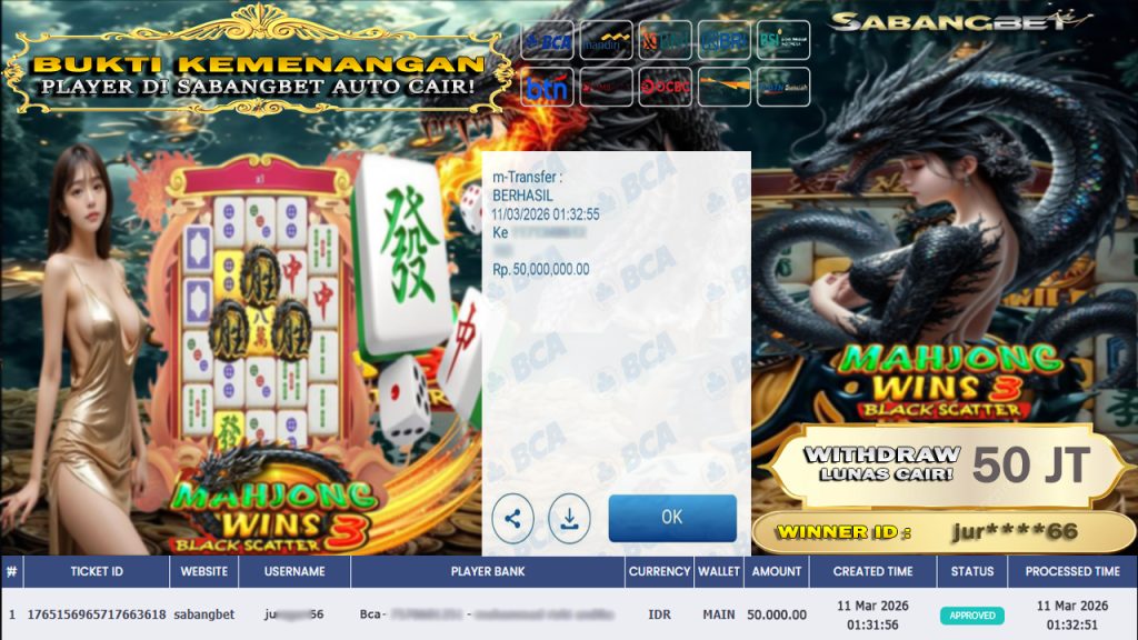BUKTI KEMENANGAN 11 MARET 2026 DI GAME MAHJONG WINS 3 BLACK SCATTER WD 50 JUTA
