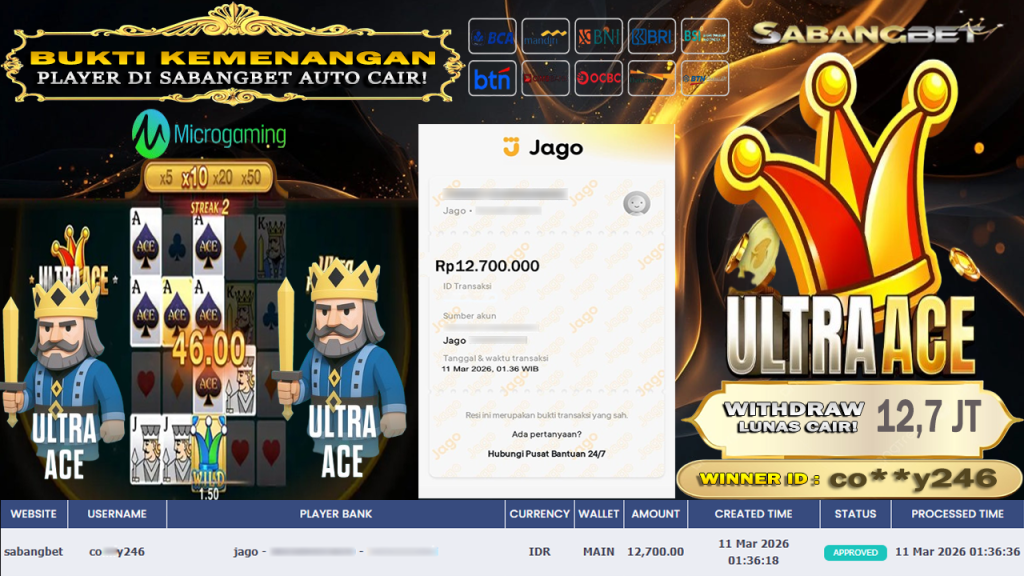 BUKTI KEMENANGAN 11 MARET 2026 DI GAME ULTRA ACE WD 12,7 JUTA