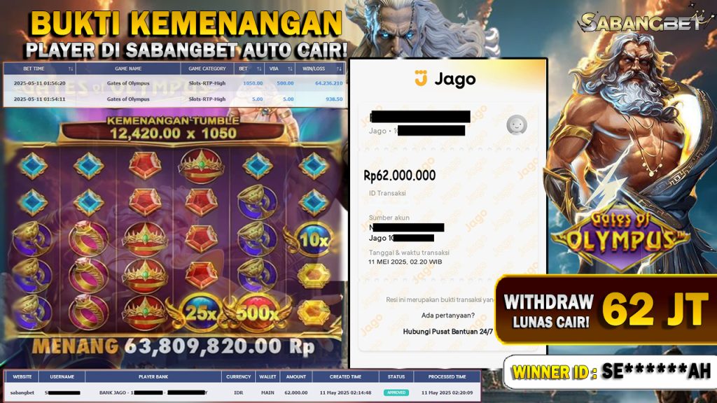 BUKTI KEMENANGAN 11 MEI 2025 DI GAME GATES OF OLYMPUS WD 62 JUTA