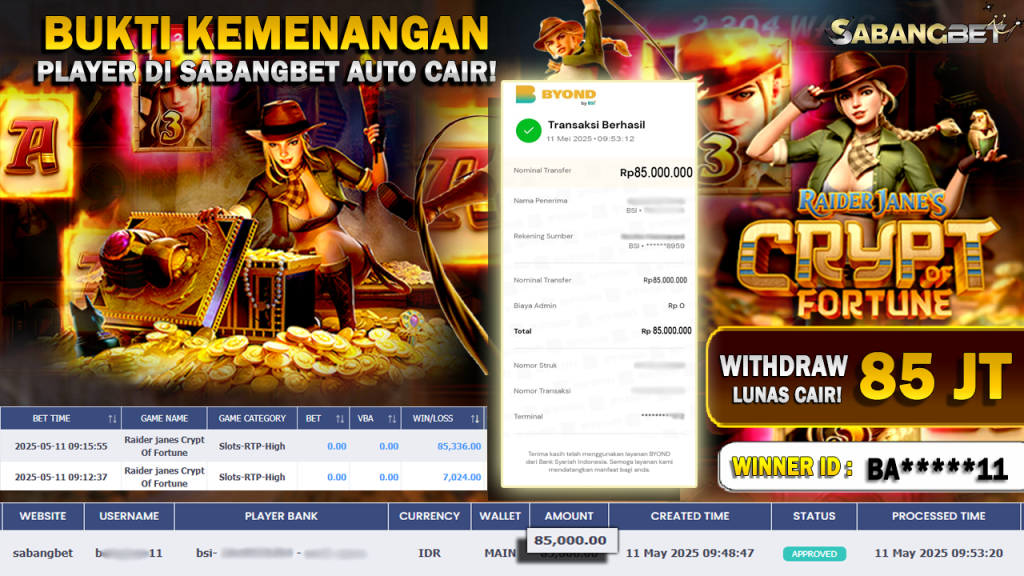 BUKTI KEMENANGAN 11 MEI 2025 DI GAME RAIDER JANE’S CRYPT OF FORTUNE PG SOFT WD 85 JUTA