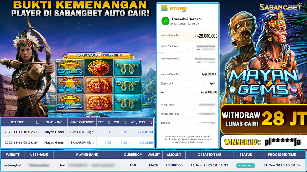 BUKTI KEMENANGAN 11 NOVEMBER 2025 DI GAME MAYAN GEMS WD 28 JUTA